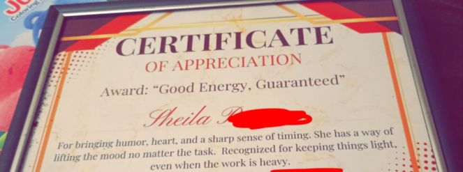 Recently, I received a (Certificate of Appreciation) award from work. I was thrilled.