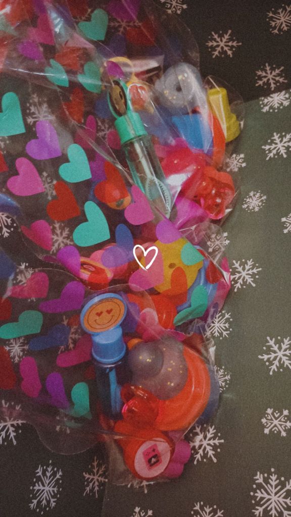 One thing I do every year and have fully enjoyed – is making up little goody bags or gift buckets for almost every holiday, and V-day is no different. I made up little baggies filled with pencil sharpeners, bubbles, cute stampers, heart-shaped rings, stickers, and little cute ducks. There’s some other stuff in them as well, and I’ll also be putting candy in them.
